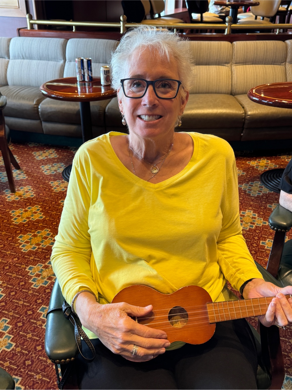 G went with me for this, as he likes anything musical, and, in fact, he actually participated in this on our Pacific Princess crossing from Los Angeles to Papeete ten years ago. As it turned out, he was a great help as he called up the finger positions on his iPhone for me to have a closer look, and, when it seemed I needed even more help, turned his phone sideways and held it next to my ukulele strings to make it easier for me to orient. Yeah, I’m not a natural but, if my fingertips survive, I’ll get there in my own time.