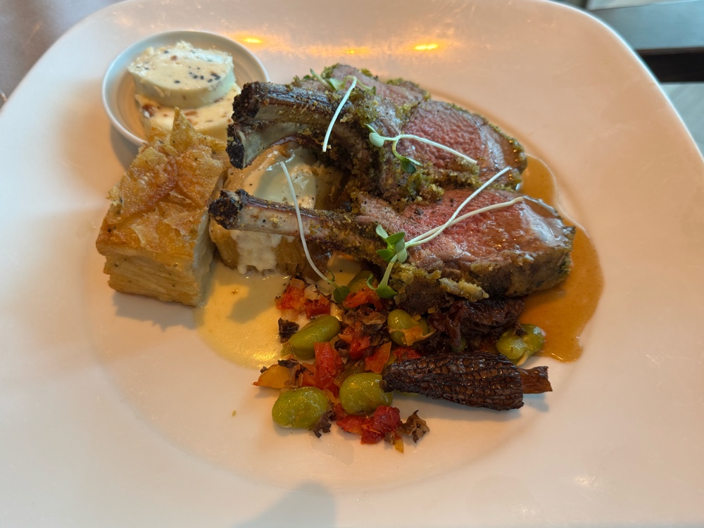 We stayed dressed for the evening, and went to the Elite Lounge in Skywalkers just for the musical entertainment and then to dinner in the Michelangelo Dining Room, where we had no right to eat ANYTHING but did anyway (split pea soup just to warm up).