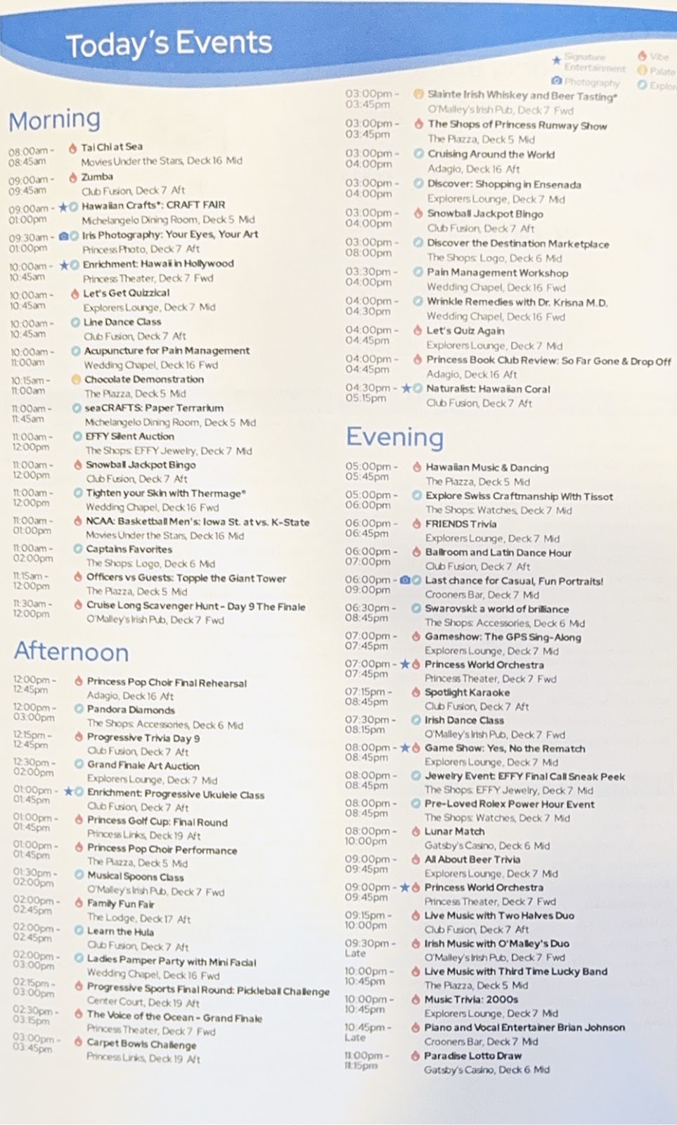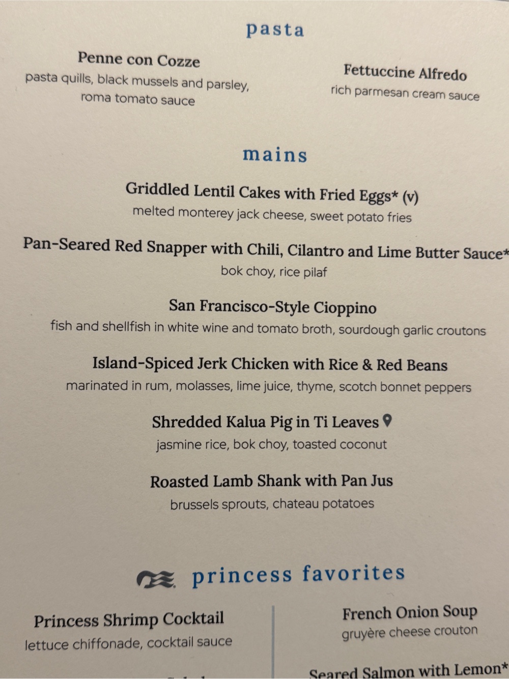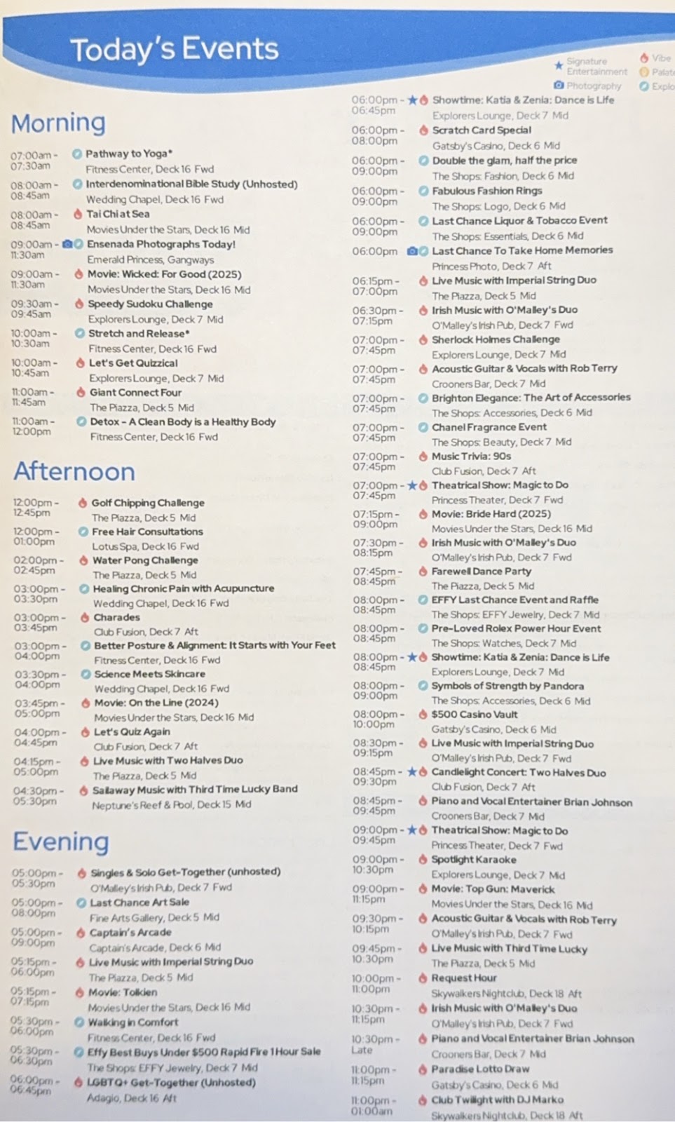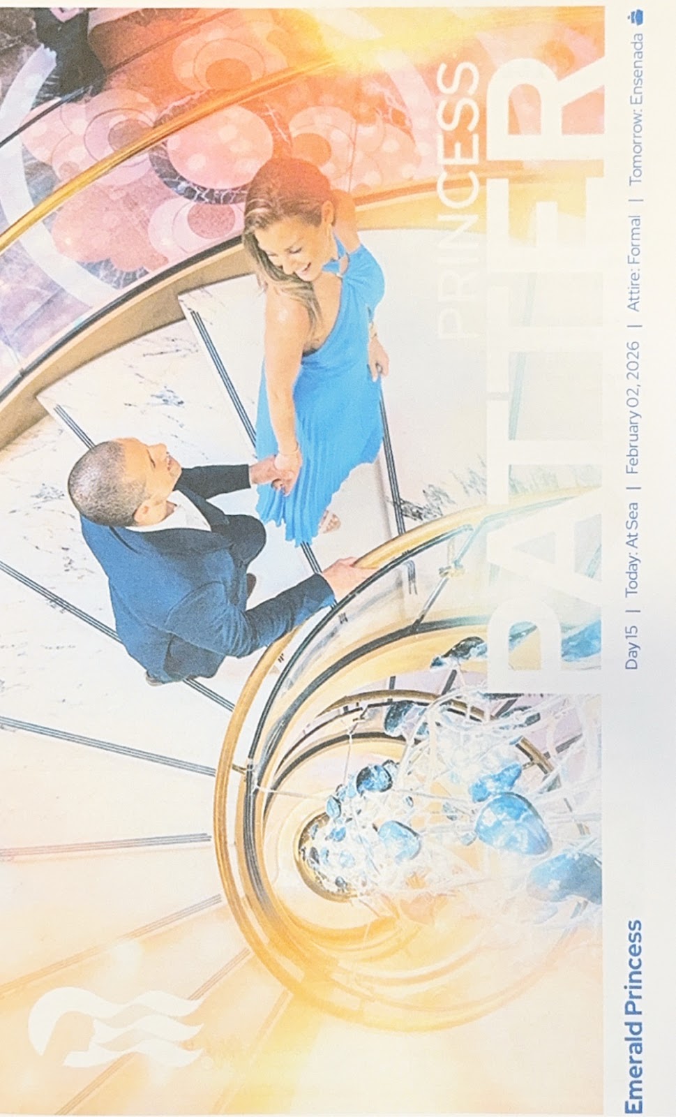 When I finally woke up this morning I did a COVID and influenza self-test I brought from home and it was negative, which I was pretty certain it would be. This is a cold, plain and simple. I ended up laying in bed for nearly 24 hours, going from messy sneezy to totally stuffed up and inhaling nasal spray all night to feeling much better this morning. G said everyone was quite concerned when I missed dinner and Restaurant Manager Nebo had offered to send anything I might want to the cabin, but I really just wanted to sleep. G went to Voice of the Ocean and the Princess World Orchestra (last night’s Princess Theater show) and said that, when he finally returned to the cabin around 9:30pm, I didn’t even wake up.