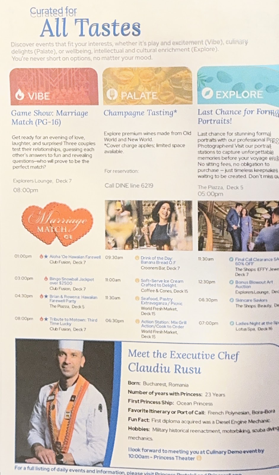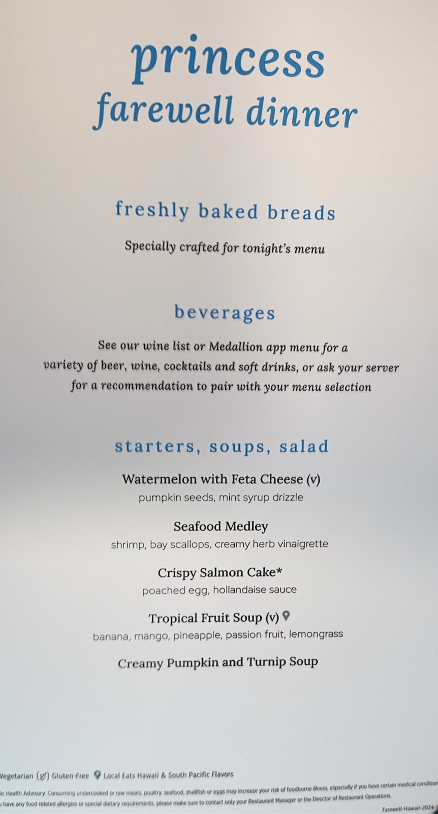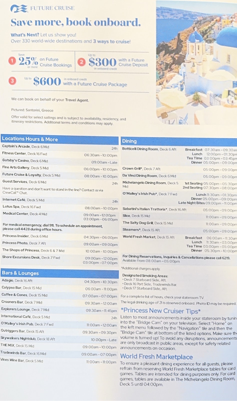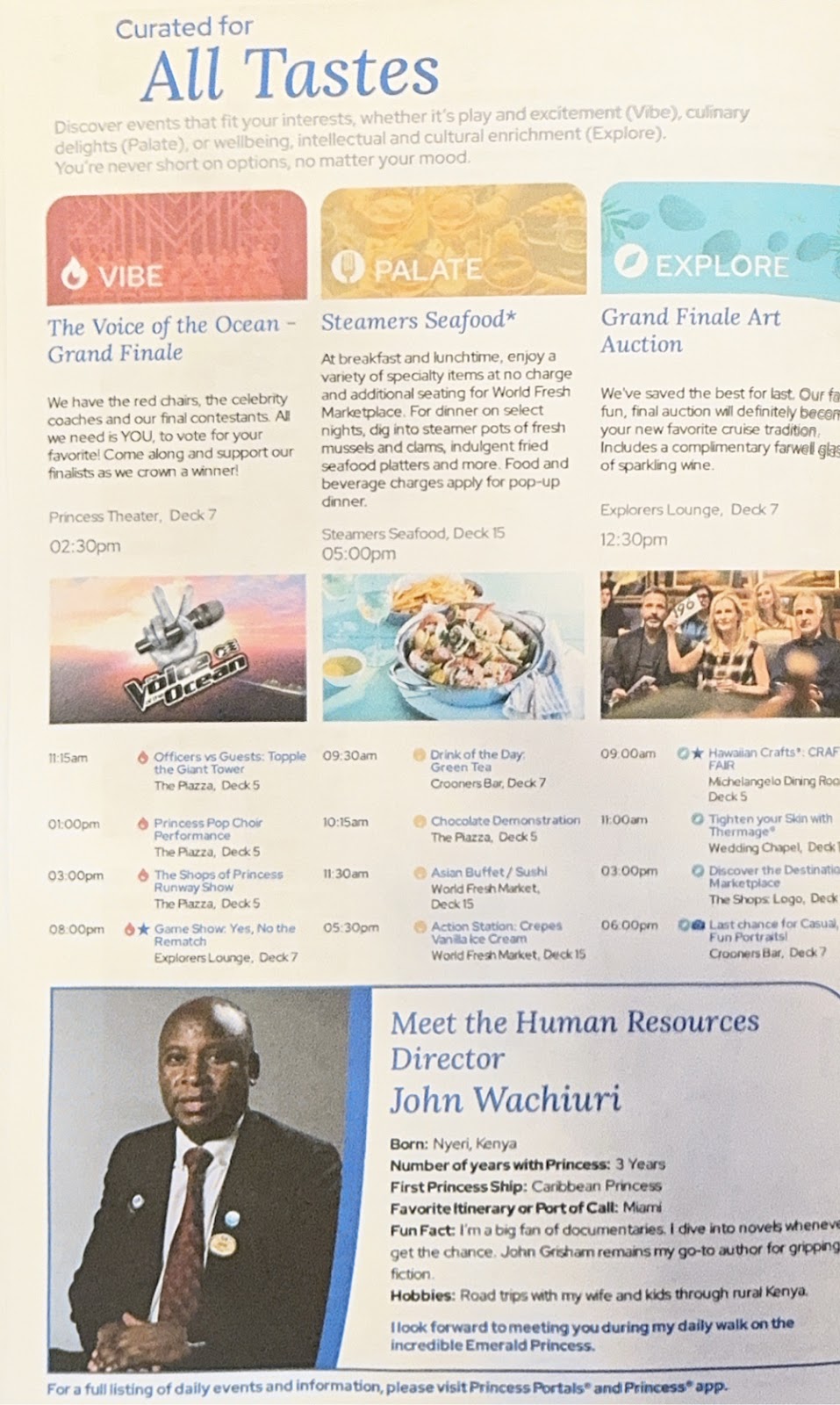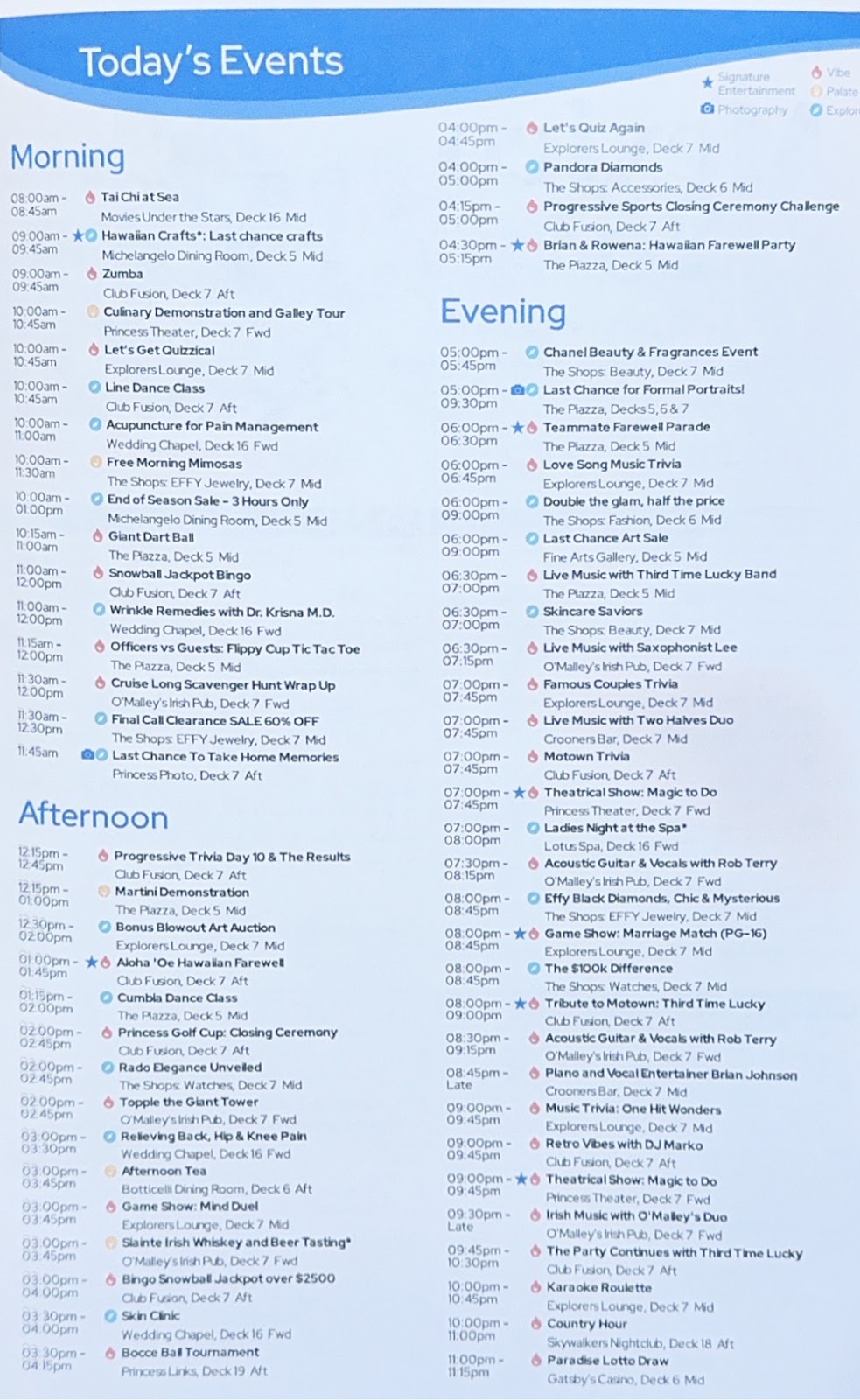 When I finally woke up this morning I did a COVID and influenza self-test I brought from home and it was negative, which I was pretty certain it would be. This is a cold, plain and simple. I ended up laying in bed for nearly 24 hours, going from messy sneezy to totally stuffed up and inhaling nasal spray all night to feeling much better this morning. G said everyone was quite concerned when I missed dinner and Restaurant Manager Nebo had offered to send anything I might want to the cabin, but I really just wanted to sleep. G went to Voice of the Ocean and the Princess World Orchestra (last night’s Princess Theater show) and said that, when he finally returned to the cabin around 9:30pm, I didn’t even wake up.
