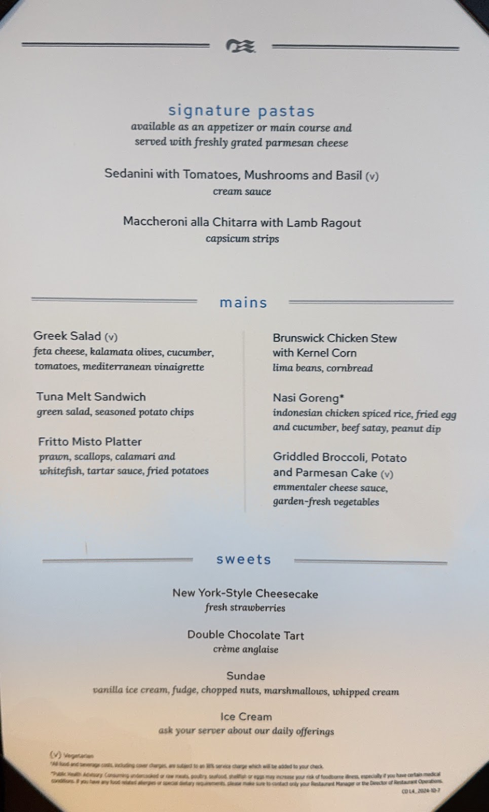 Tonight was not (hallelujah) a formal night, so I threw a scarf on over my long-sleeved T-shirt and added my fleece jacket and figured that was acceptable dinner attire. I will say that this cabin at the front of the ship has definitely increased the number of steps we walk. Well that plus the fact that the Elite Lounge was moved to Skywalkers for this cruise. Getting from Skywalkers to the Michelangelo Dining Room at 5pm is a journey worthy of carrying a sack lunch: walk down the aft stairs to Deck 15, forward through the World Fresh Marketplace and past the Calypso Pool area, and down a mid ship elevator to Deck 5, always the milk run at that time of day. The aft elevators are totally packed with people going to the Botticelli Dining Room.