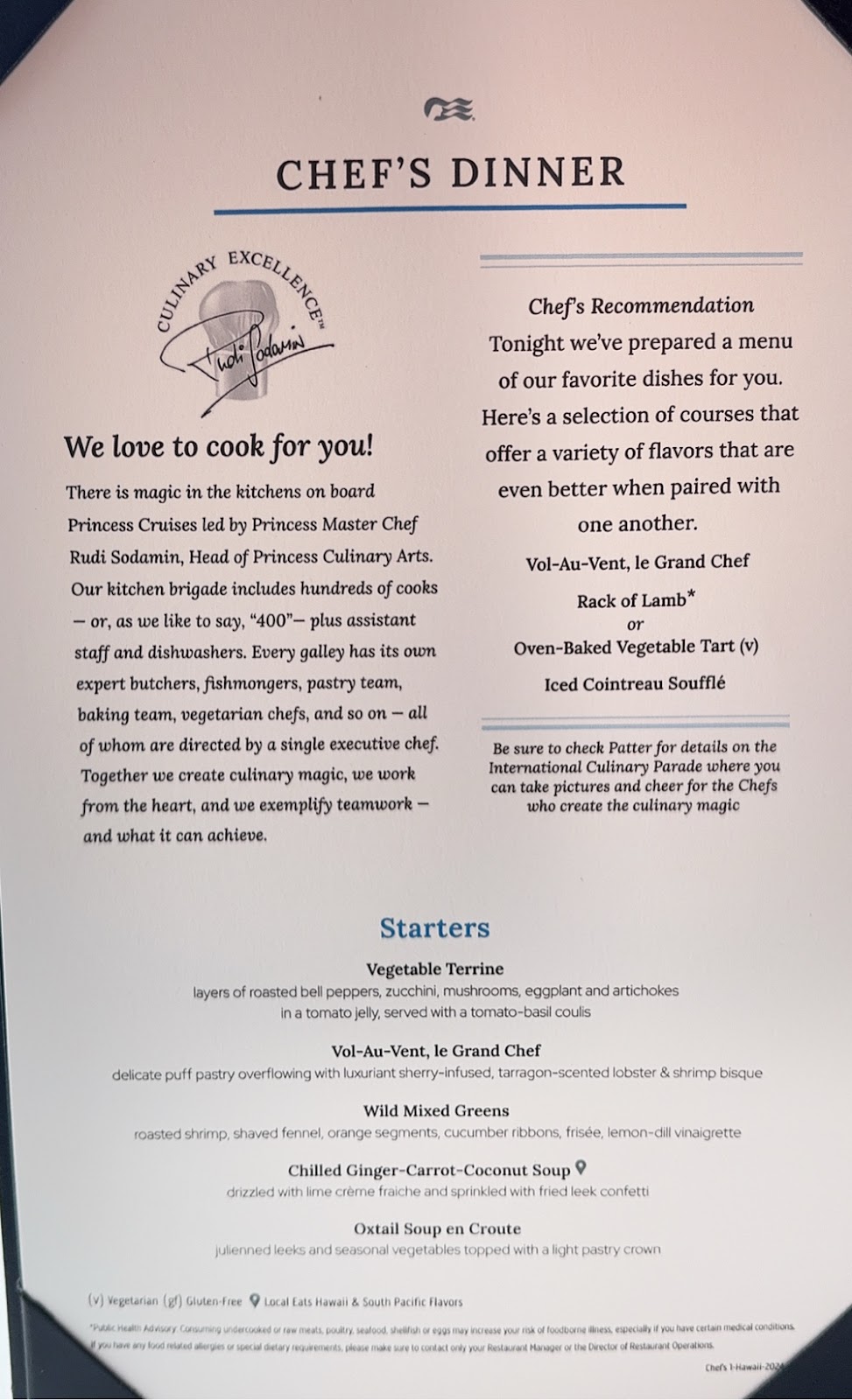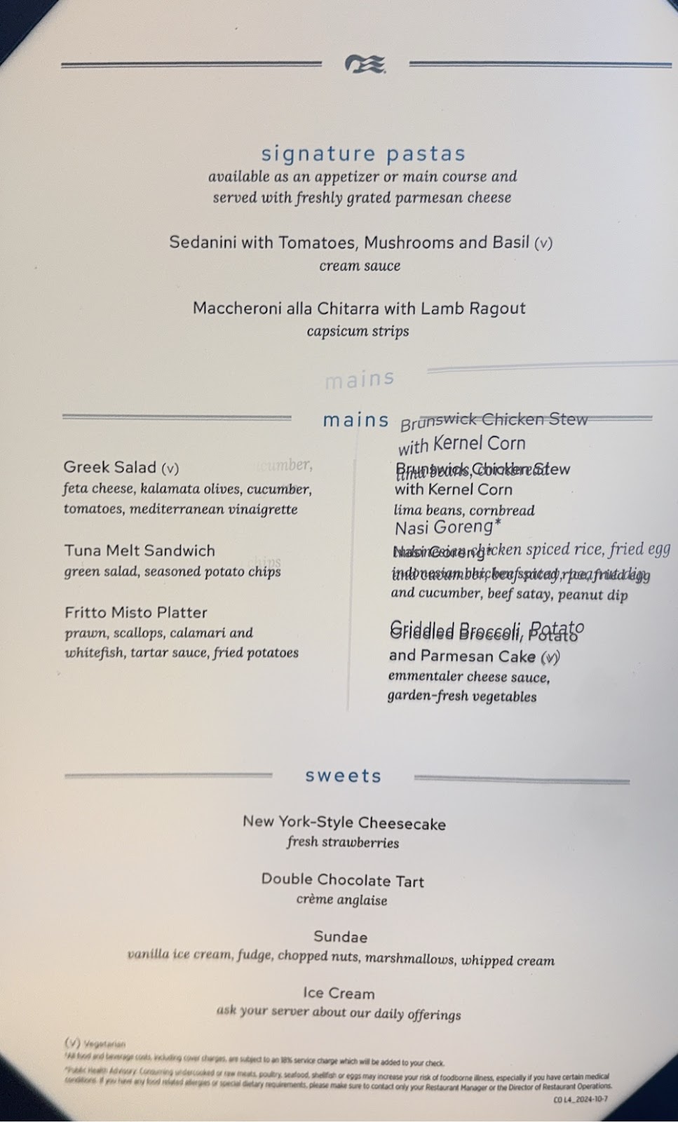 We went to both breakfast and lunch in the Botticelli Dining Room and in between, at 10:15an, there was something called Hotel at Sea in O’Malleys. That sounded different and interesting, and we were happy to see F&B Director Roy and his Food Supervisor and Beverage Supervisor and they talked about provisioning (watermelons provisioned in Honolulu cost 5x as much as watermelons provisioned in San Pedro!).