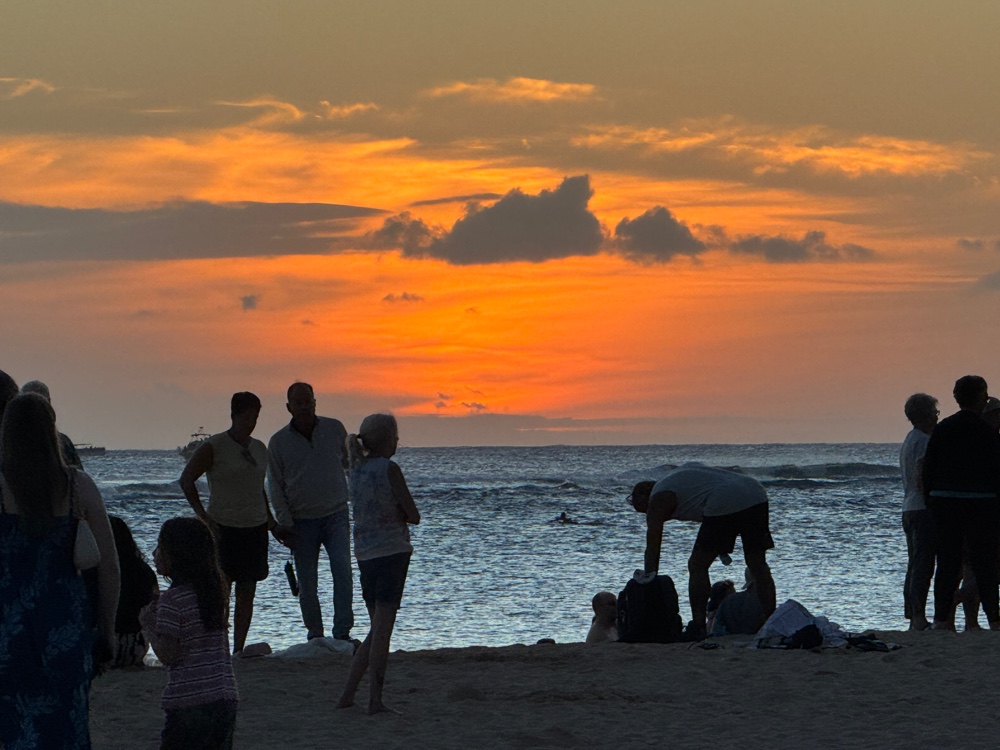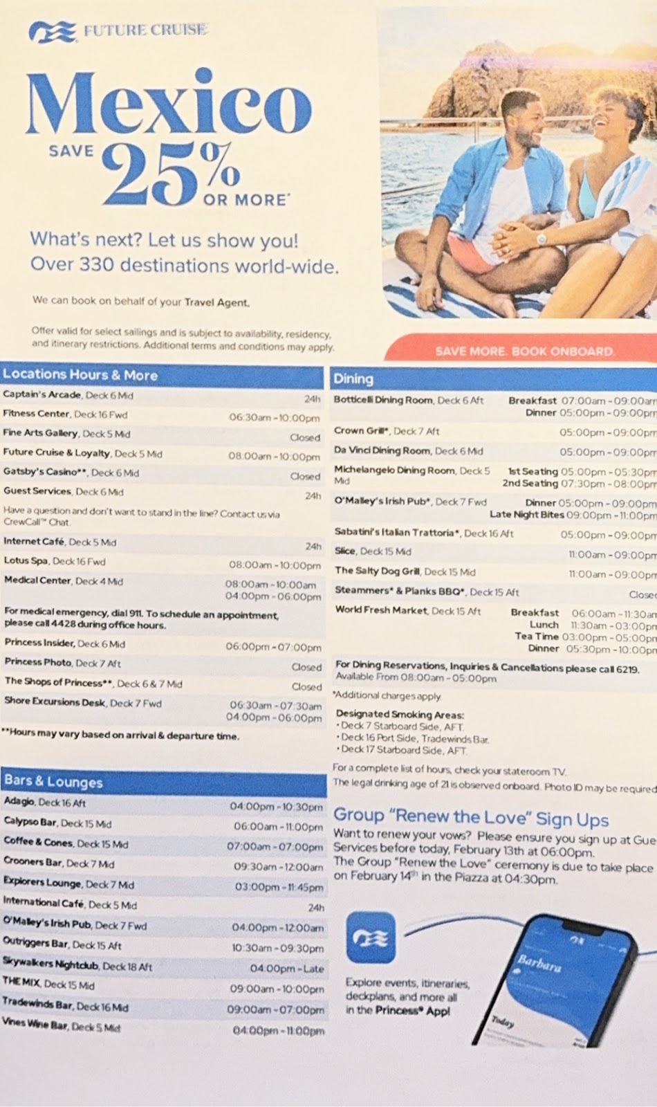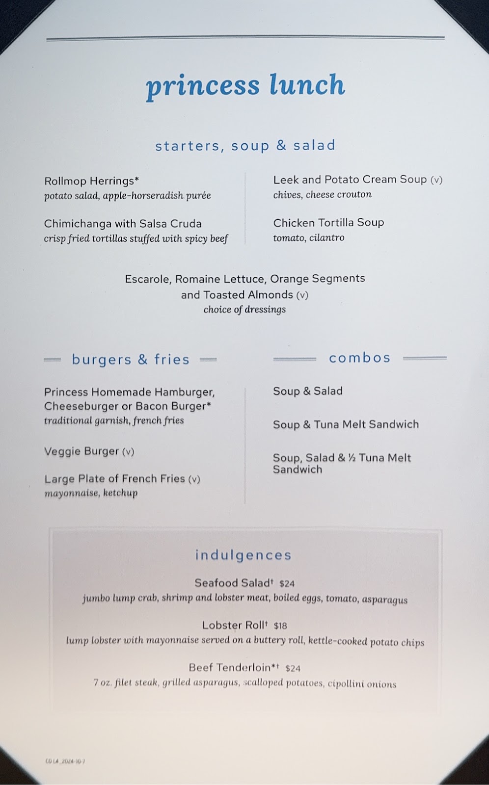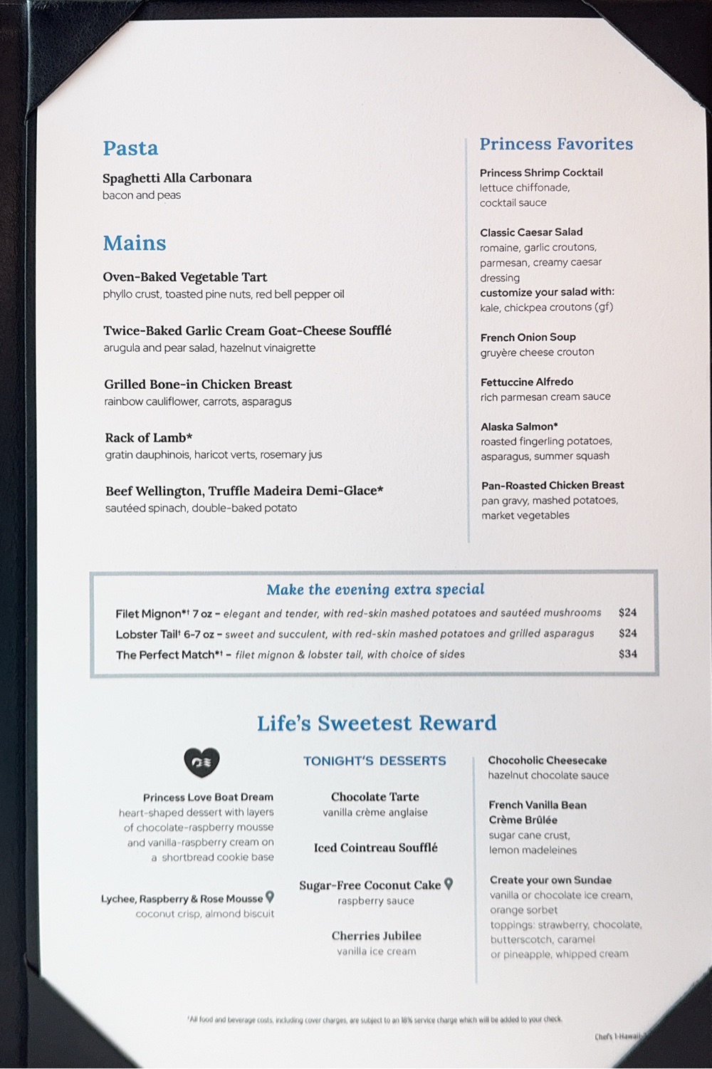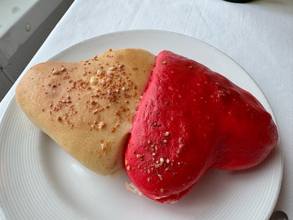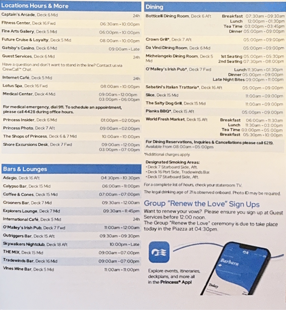 The act of getting around the ship is wearing us out, and we returned to the cabin to rest until Elite Lounge and that was an experience. We positioned ourselves in Skywalkers where we could watch down the length of the ship as the waves crashed over the bow. They were impressive, kind of like fireworks. To be fair, we’ve twice seen them larger, where they crashed well above the Promenade Deck, both times in the Tasman Sea, but these are definitely the worst we’ve seen in this section of the Pacific Ocean.