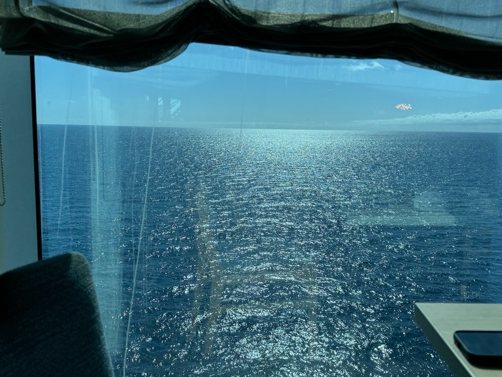The bounciness we’ve been dealing with is being caused by deep swells coming from hundreds of miles away. Despite the rough seas, it was sunny today with temps in the mid 60s, and wasn’t even horribly windy. Some people were sitting on the open decks, but the pools were all partially drained and netted over.