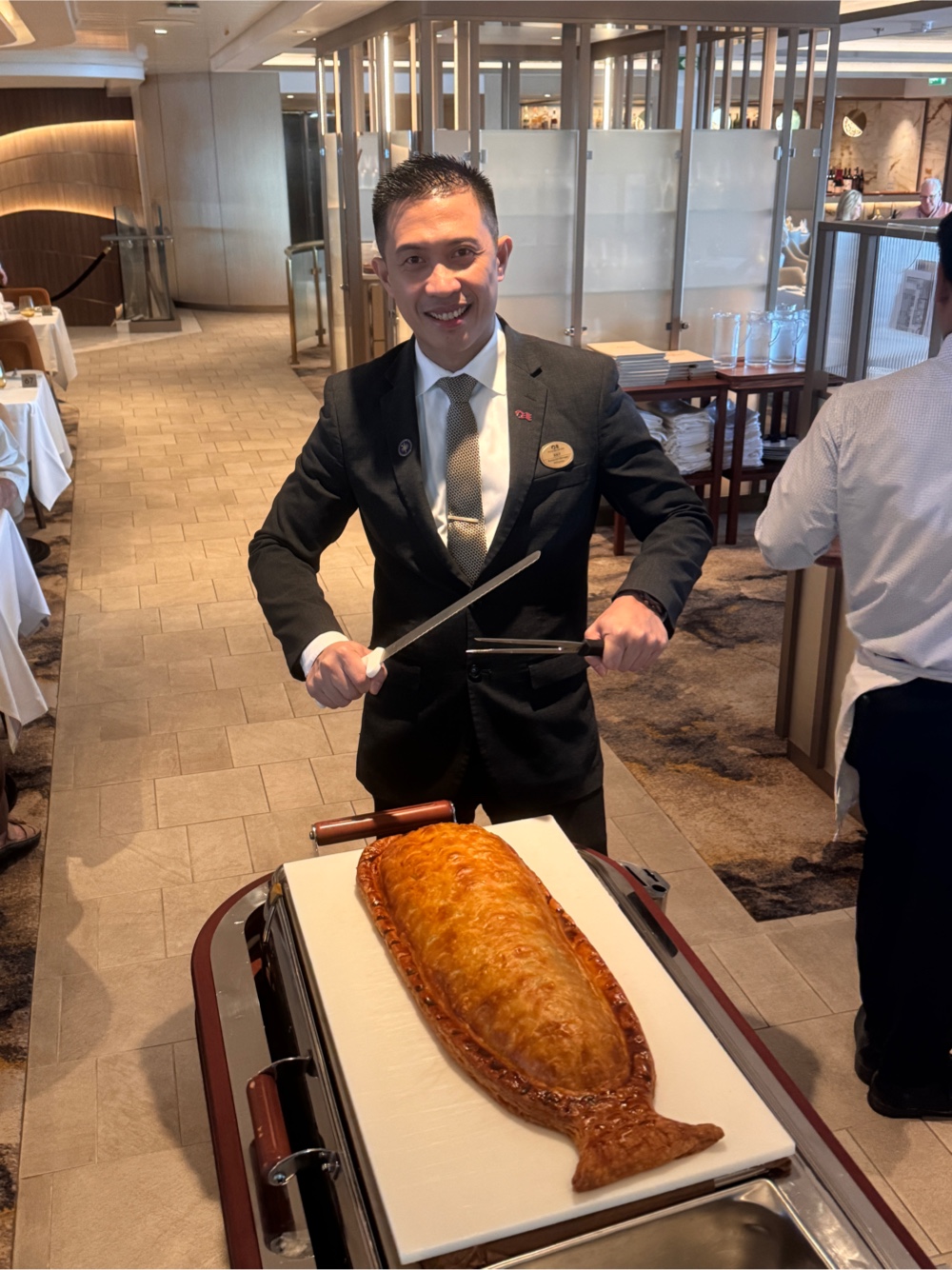 We were invited to drop the luggage we’d carried on in our cabins, but were warned that they wouldn’t yet be ready. But our steward was just vacuuming ours and said we could move in right away. And that is how we both came to be unpacked before we went to lunch. Meanwhile, while I unpacked, G ran down to the Celestial Dining Room to meet restaurant management about our dining reservation.
