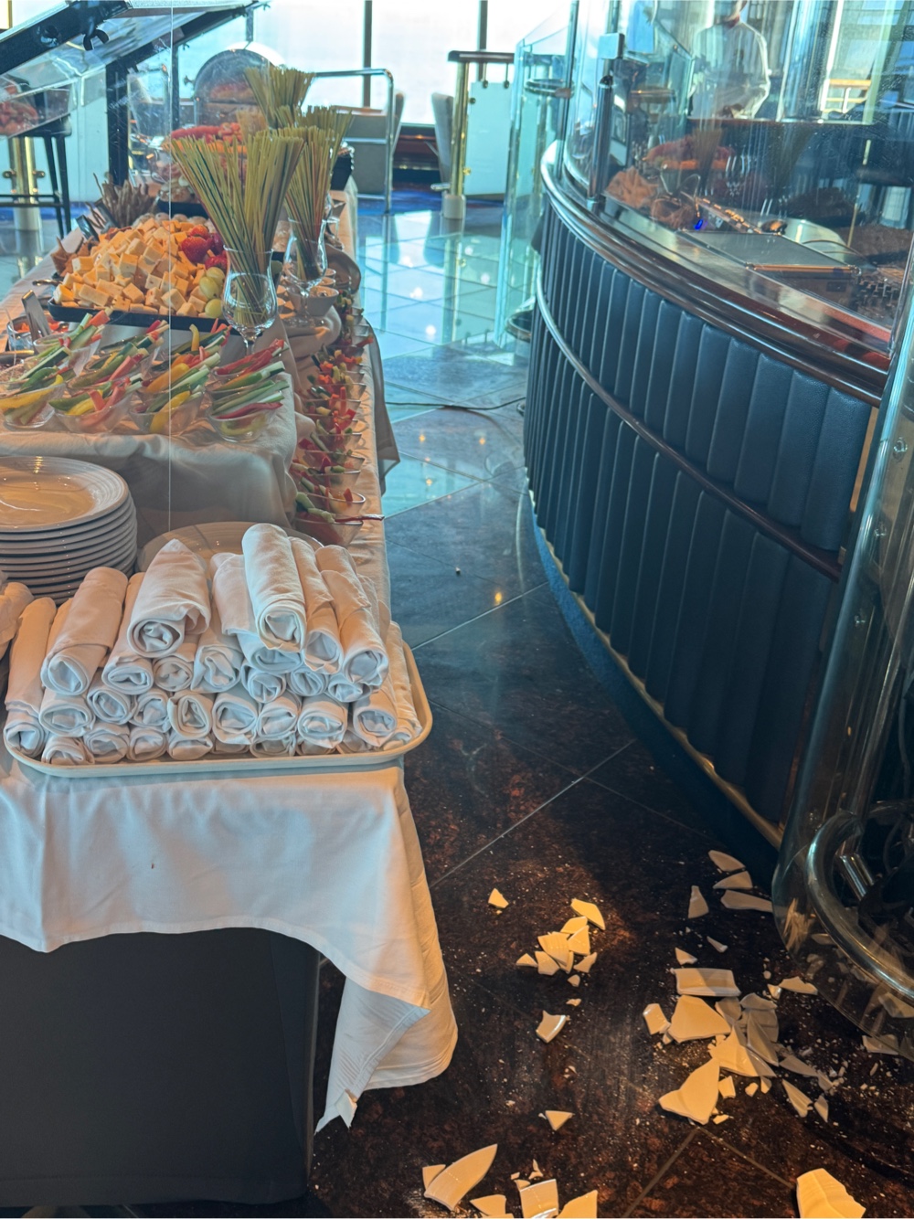 G was cleaned up for the evening by the time I returned to the cabin, so I took advantage of the time he was at the military gathering to do the same, and took what was a real one-handed shower as I held on for dear life with the other hand. G texted me a photo from the Elite Lounge in Skywalkers and told me not to come up there; a stack of plates had just crashed to the floor, followed by still more. He said it was difficult to even walk in Skywalkers.
