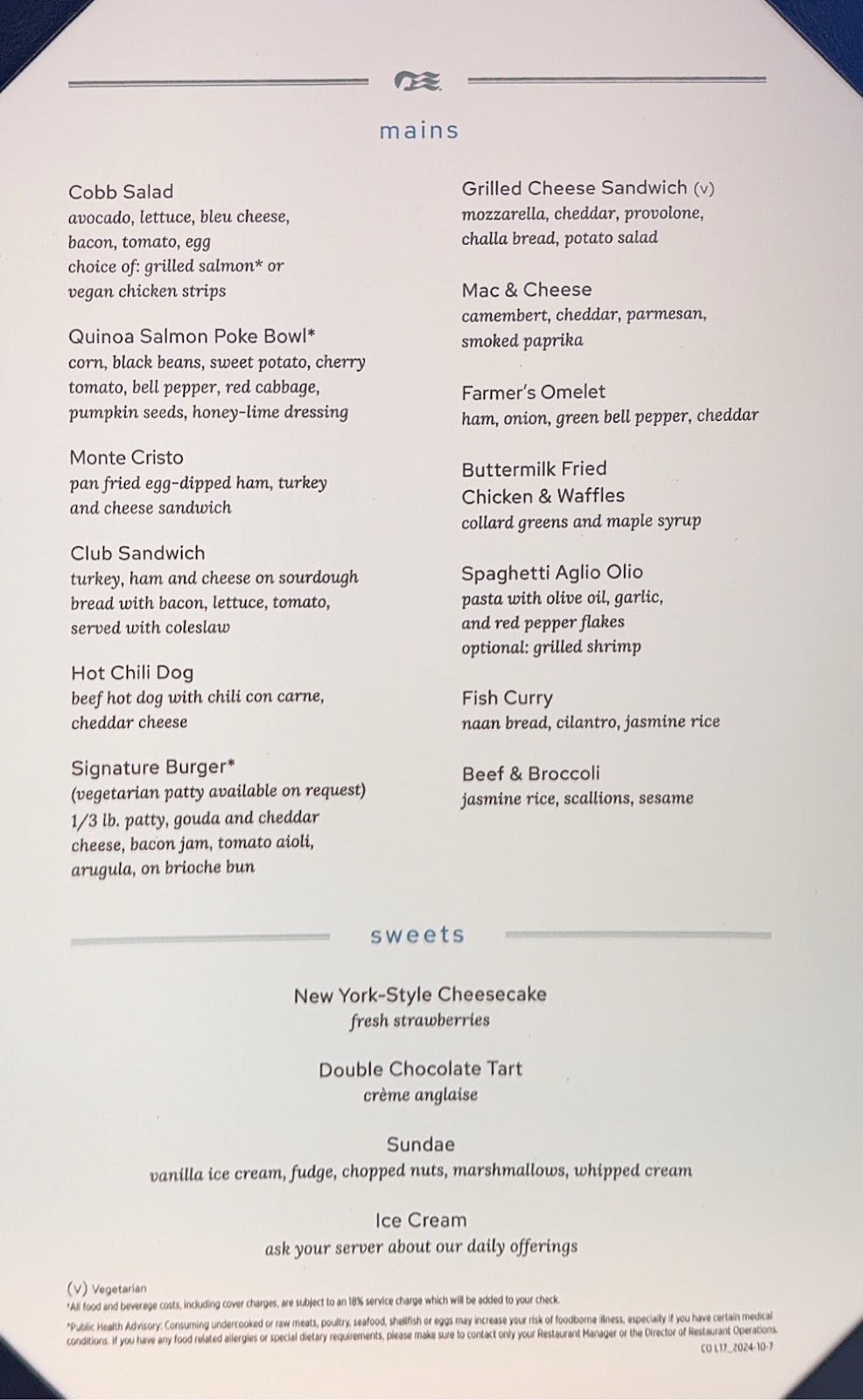 I spent the afternoon laying on my lumbar stretcher on the cabin floor with my legs on the bed and that really did the trick. But I started feeling stuffy again and G talked me out of going to dinner but suggested I could try going to the show but that is how I got sick in the first place and I don’t want to spread this. Then CD Nathan announced that, due to cast illness (it really is a sick ship), Magic To Do was being cancelled again, and instead Jason O would do his Sing Us a Song show, so I decided to just have some dinner in the World Fresh Marketplace (fish and brussel sprouts) and call it a night. I spent the solo time watching Roaming Wild Rosie’s YouTube video of her Arizona Trail hike this year. So entertaining!