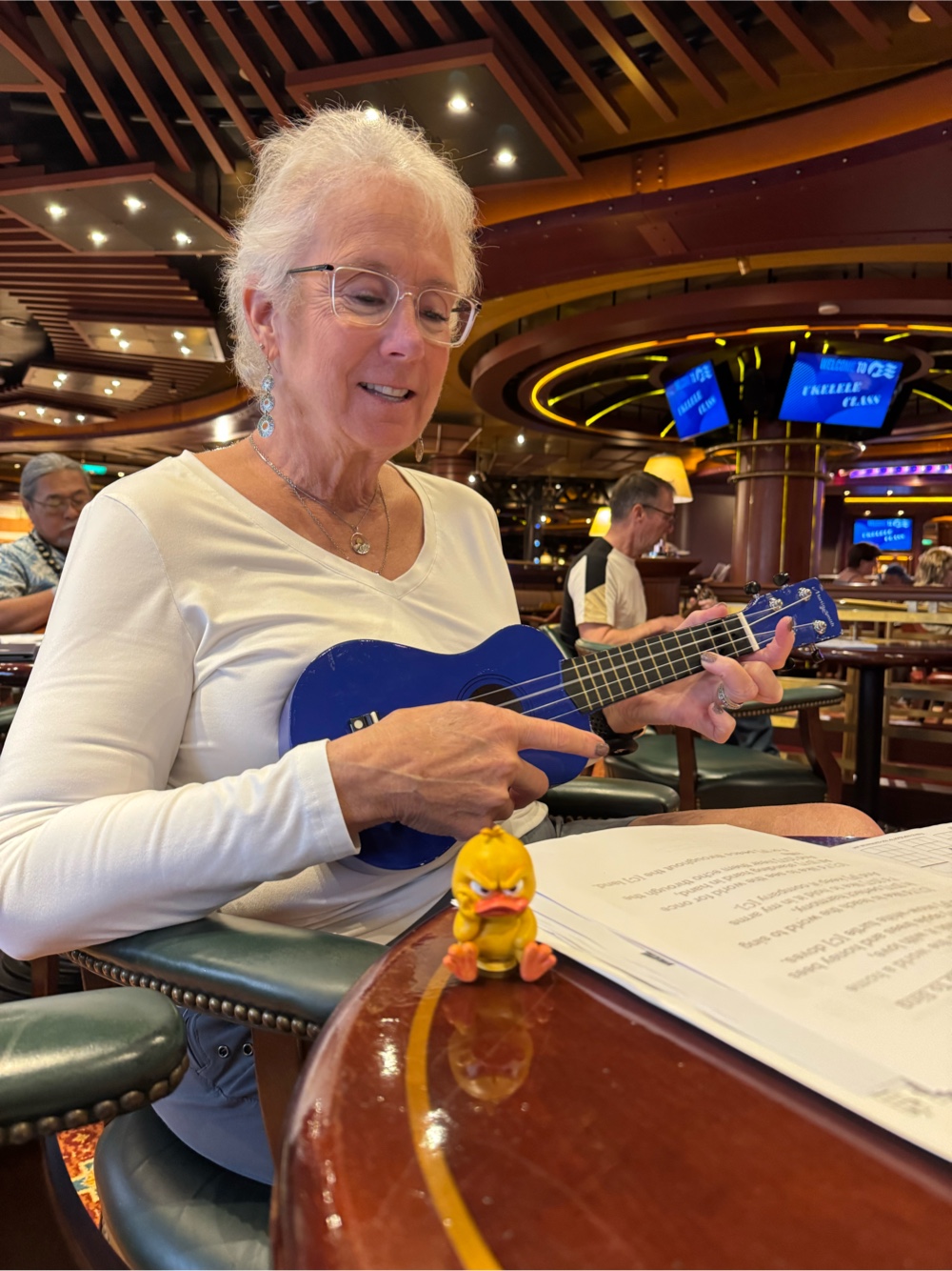 Lunch was followed by ukulele (what else?) but I was delighted when new friends Mary and Ed showed up bearing gifts. Ed is a talent with a 3D printer and air brush, and prints and paints the cutest ducks and other items, like textured heart ornaments and iPhone holders to use on plane tray tables. It was like Christmas for me and even better when they stuck around for a few songs and cheered me on.
