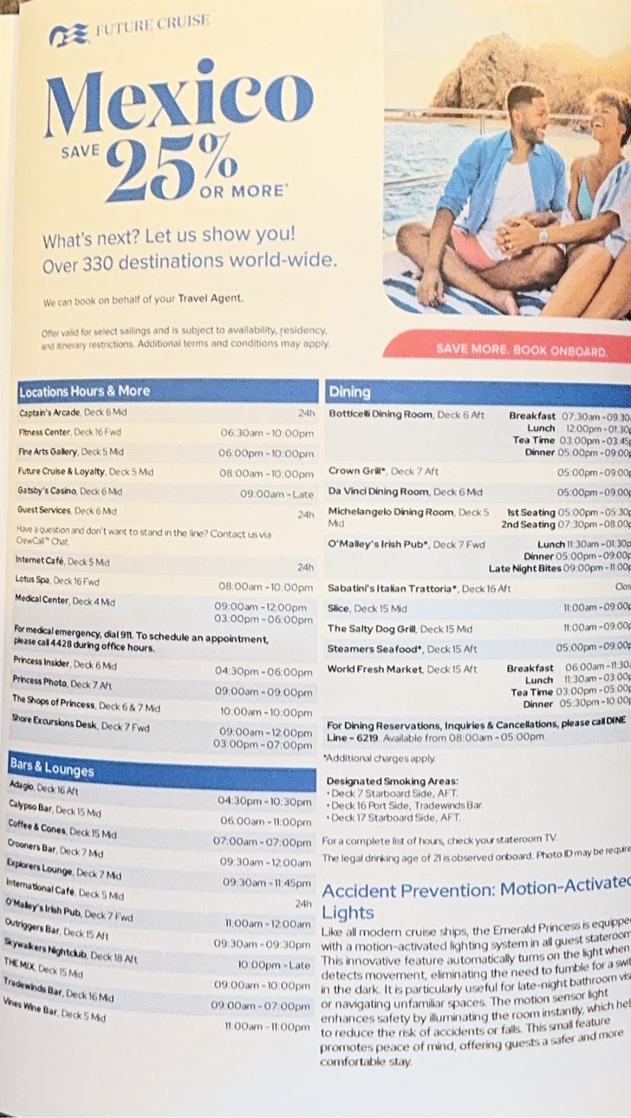 That luncheon (and the wine) always ruins us for the rest of the afternoon. We collapsed on the bed and talked about…the cruise we just recently booked for April. We already know that Michael and Zenny who were on the first two of these Emerald Princess cruises will be traveling with us and today we found that luncheon table mates Jeff and Desiree will be also. It’s always fun to see familiar faces on board.