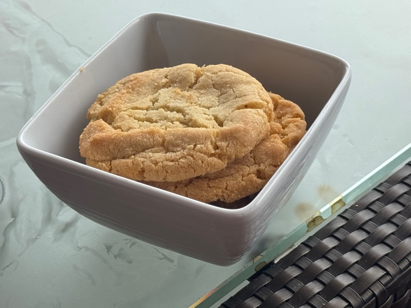 A couple of people have emailed me commenting on my healthy diet. Don’t let them know that I just discovered that the oatmeal cookies on board don’t have raisins. Raisins in baked goods are an abomination until the Lord, and, absent them, these oatmeal cookies are the bomb.
