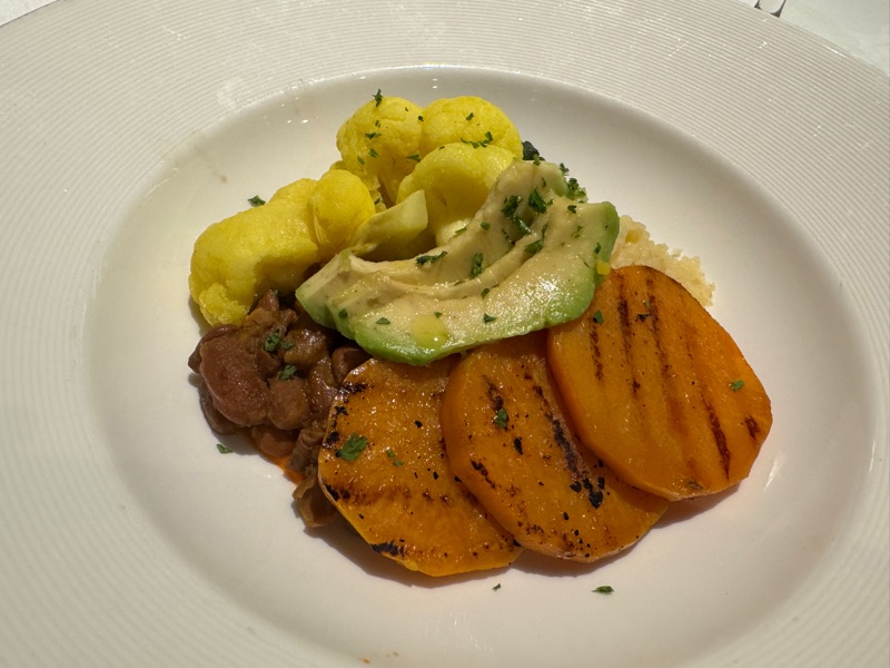 We skipped lunch in the dining room and I had another fajita salad in the Horizon Court Buffet. I love those; I think it’s because of the shredded lettuce that makes them so easy to eat when I’m sitting in a comfy chair on the Horizon Terrace. I get a deep soup bowl, fill it halfway with lettuce, then fill the rest of way with chicken, peppers and onions, and top it with salsa, guacamole (no cheese or sour cream) and all the broken tortilla chips I can find in the bottom of the serving bowls. Yum!