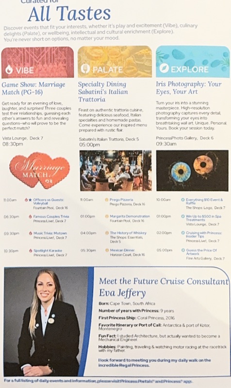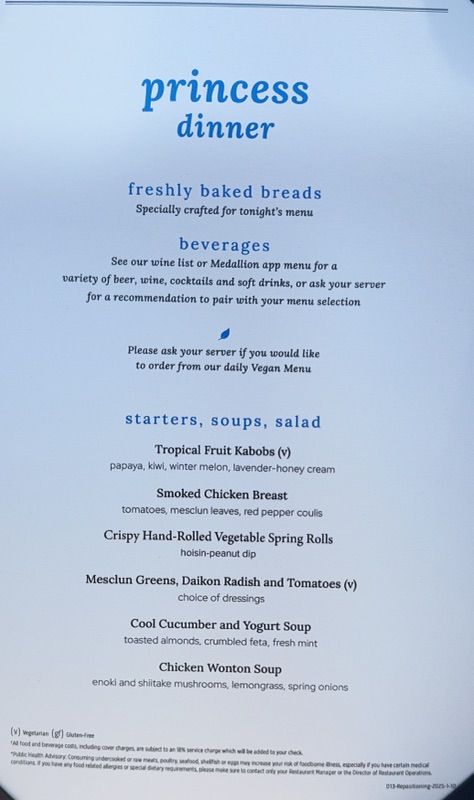 We were sitting at dinner in the Symphony Dining Room just after 5pm when G commented that the captain was surely going to tell us something soon when-boom- he made an announcement to do just that. Of course, we’re missing Grand Cayman; the port is actually closing, so this wasn’t a Princess decision to make. No one seems too bothered by it.