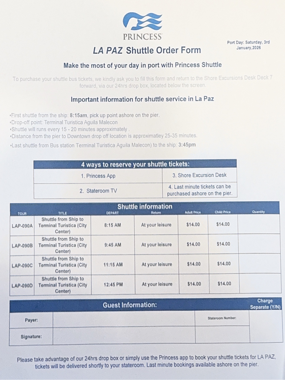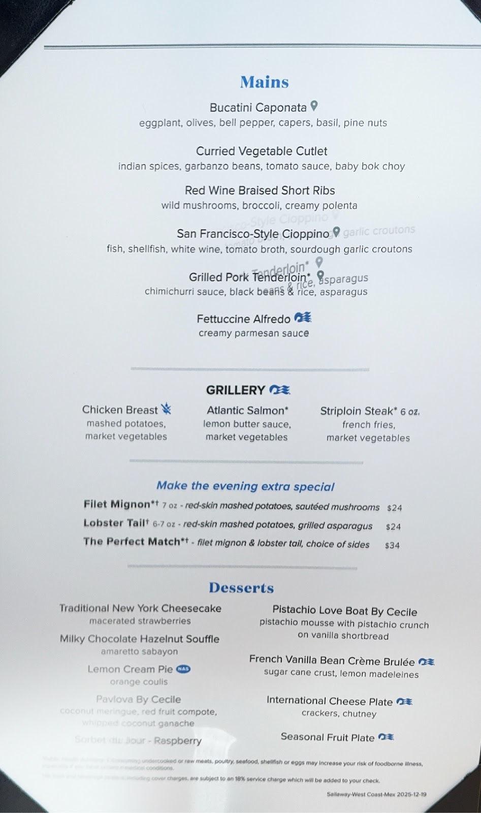 Happily, our servers Rex and Raol were wonderful, and dinner was delicious. But we are left to wonder about what has led to the degradation of the dining system on Princess. Certainly the introduction of Reserve Dining is part of the reason, but one would think it has been offset by the introduction of the Premier package with its unlimited specialty dining.