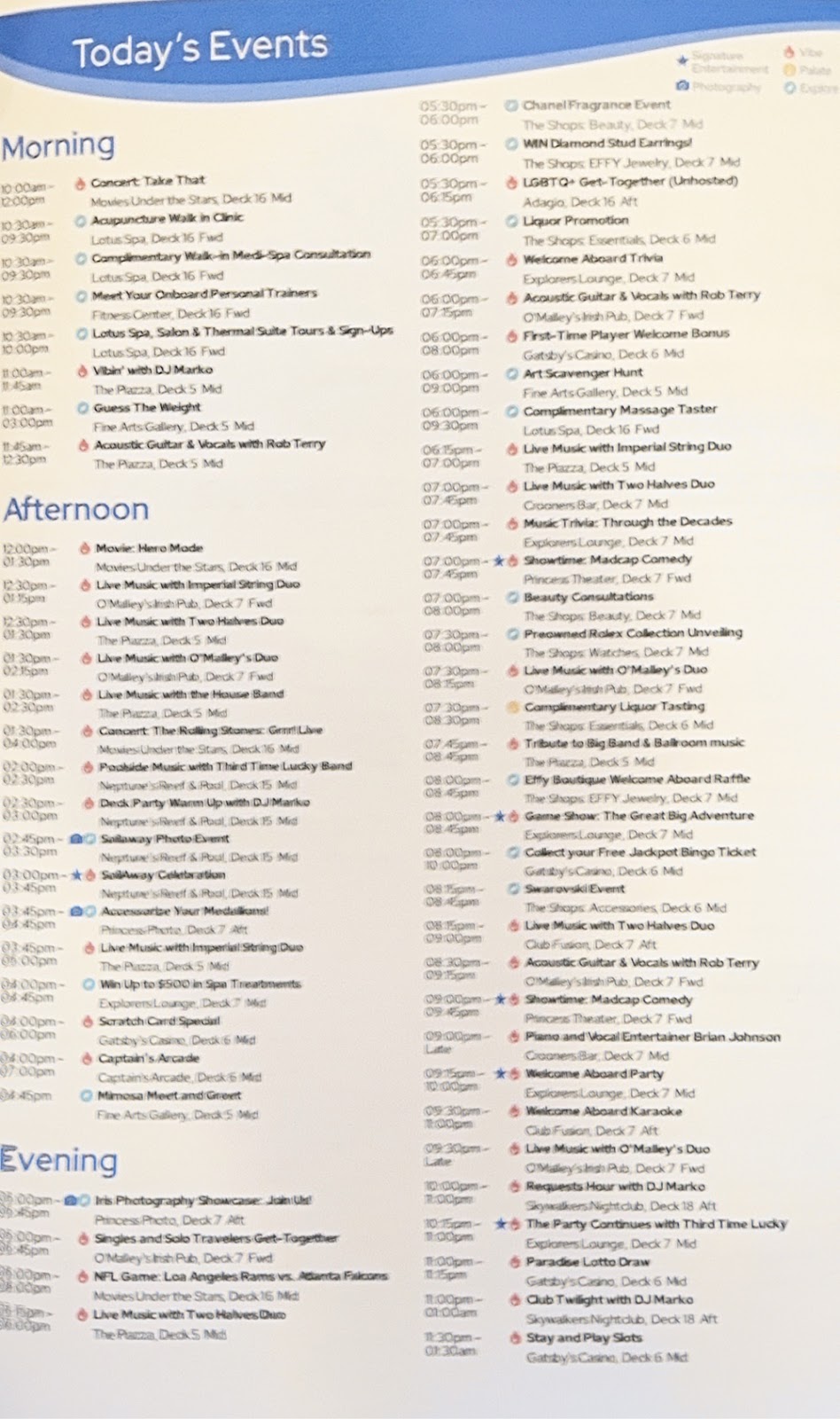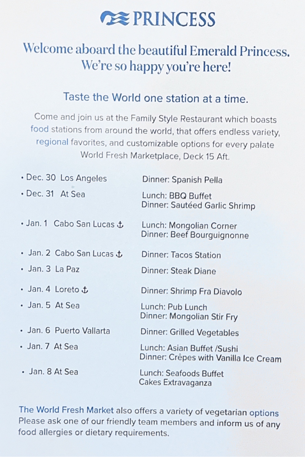 After 45 minutes of waiting, he got nothing, and, since I was first in line, I got a nice table for two next to a window (in fact, a table we’ve had many, many times on previous Emerald cruises)…for tonight only. No amount of cajoling would get us assigned to that table for the remainder of the cruise. As for the Michelangelo Dining Room, the high number of in transit passengers had every reservation locked up in there until late dining. So how do we get one of those tables for next cruise? We’re not sure, but it’s good to have goals. In the meantime, for the next nine nights we will be waiting outside the Da Vinci Dining Room on Deck 6 to get a table. And, yes, we had phoned the Dine Line on land and that 45 minute waste of time yielded nothing.