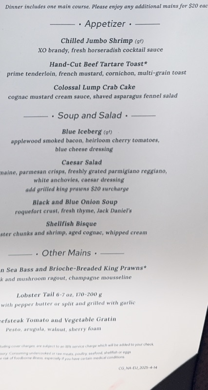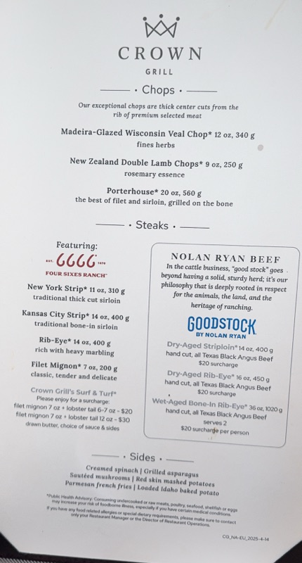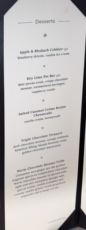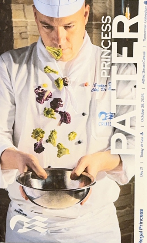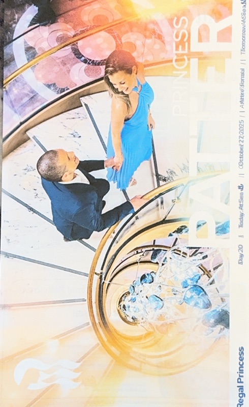 We were there when the restaurant opened at 6:30am, using the front elevators to go directly from our cabin (M437, now that we’re off the ship) to Deck 5 (easy peasy at that time), taking all our luggage with us. We always appreciate the calm that pervades Sabatini’s breakfasts but never more so than on disembarkation day. Pure bliss. It was hard to say goodbye to the Indian mafia (their term), Raj, Royal, Francis and Tony and Philippino waiter Roderick. As G told them, regardless of how good any future cruise dining experience is, it will never top this one.