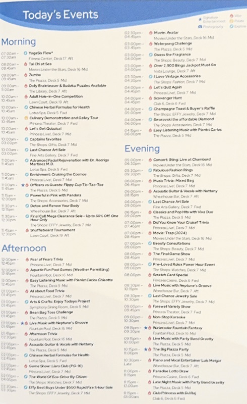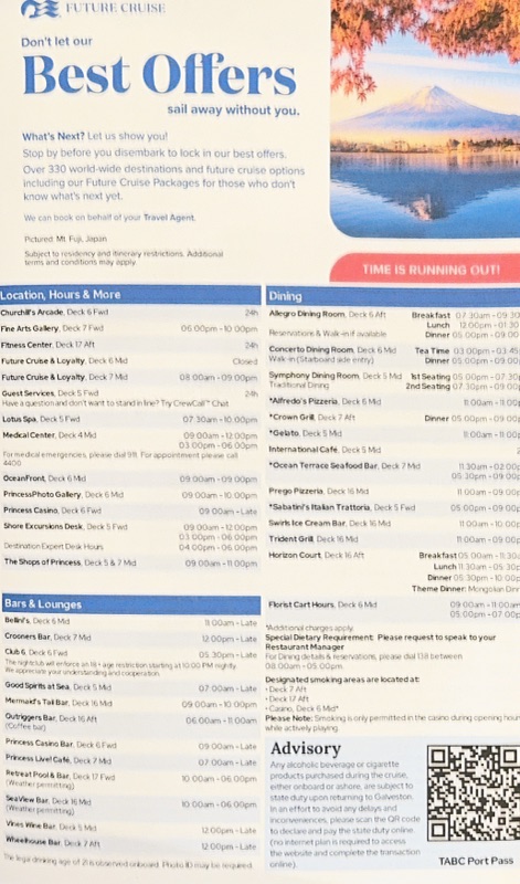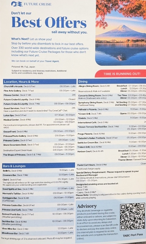 G and I were both extremely fortunate that we didn’t face any of the major flight delays that have been popping up across the country. It was also nice, while in the USO, to overhear a Southwest pilot reassure someone there that these winds weren’t going to be an issue. Not that I was worried…but it was nice all the same. They were gusty! In fact, about the time the Regal Princess docked last night, a cargo ship hit a pier in Galveston and that’s now a whole thing, with an oil spill in the harbor that has it partially closed to ship traffic until it is cleaned up. The first Regal Princess cruise out of Galveston this season is impacted. Sound familiar? Guess we were fortunate to safely get into port at all!