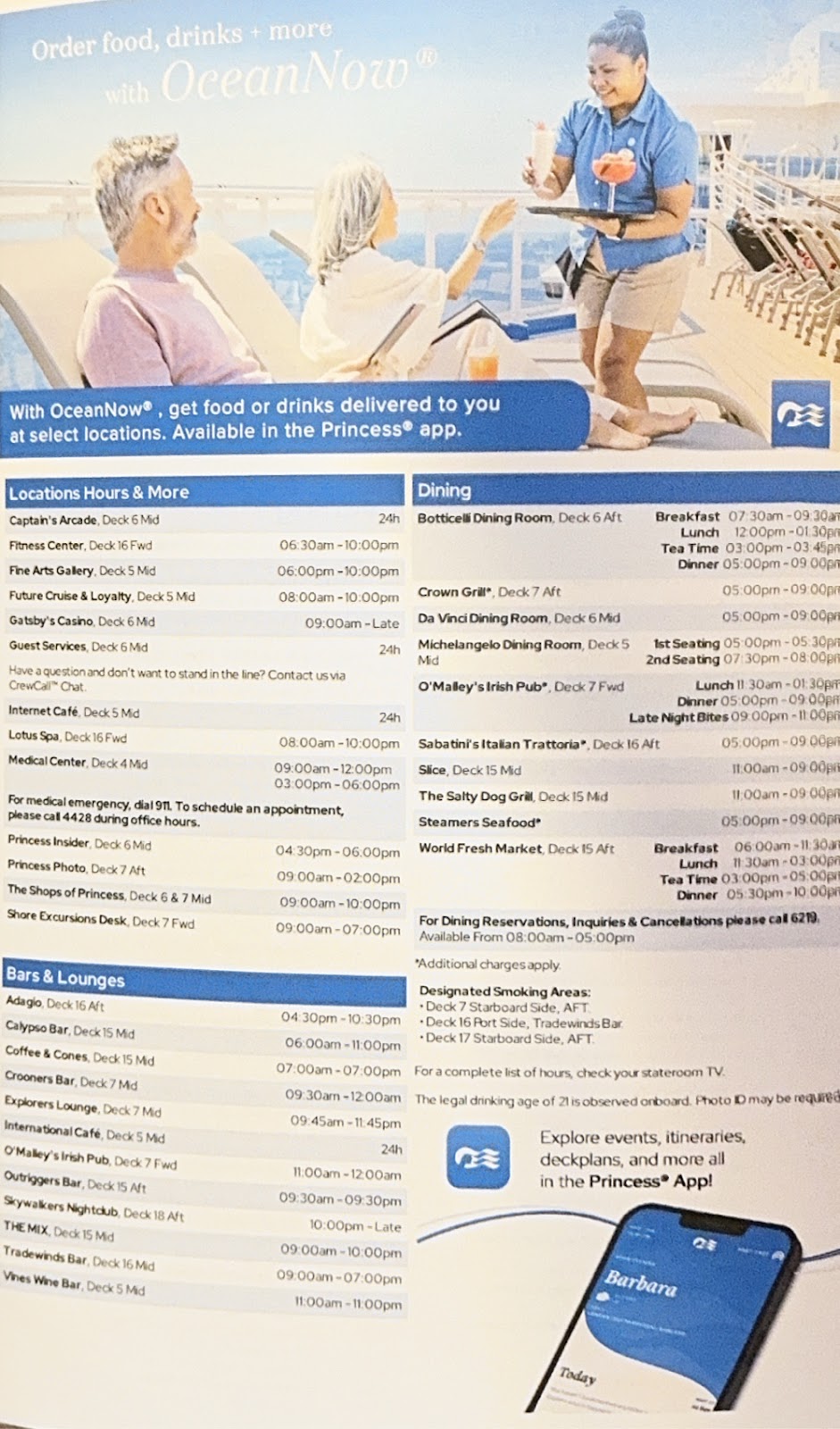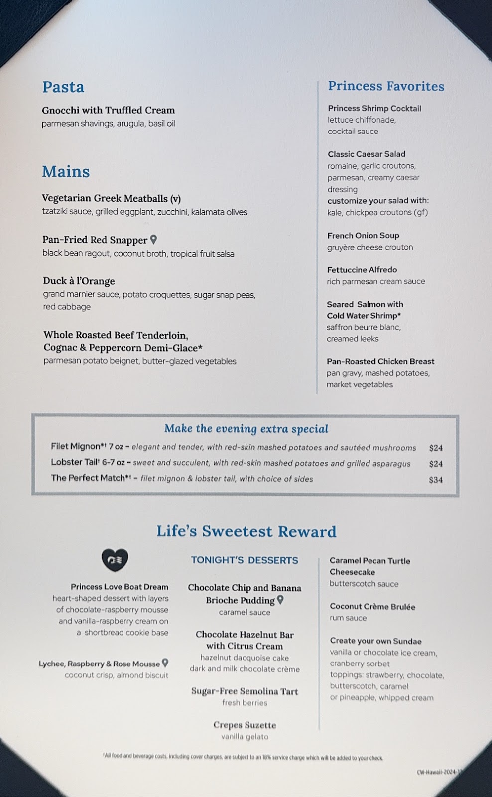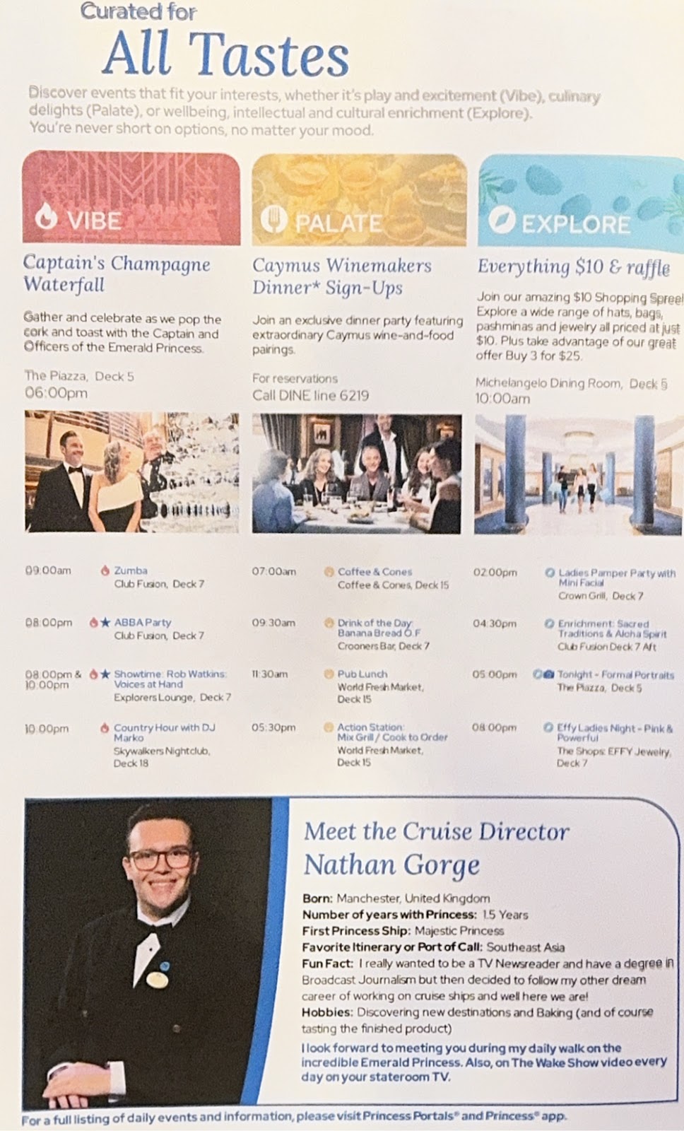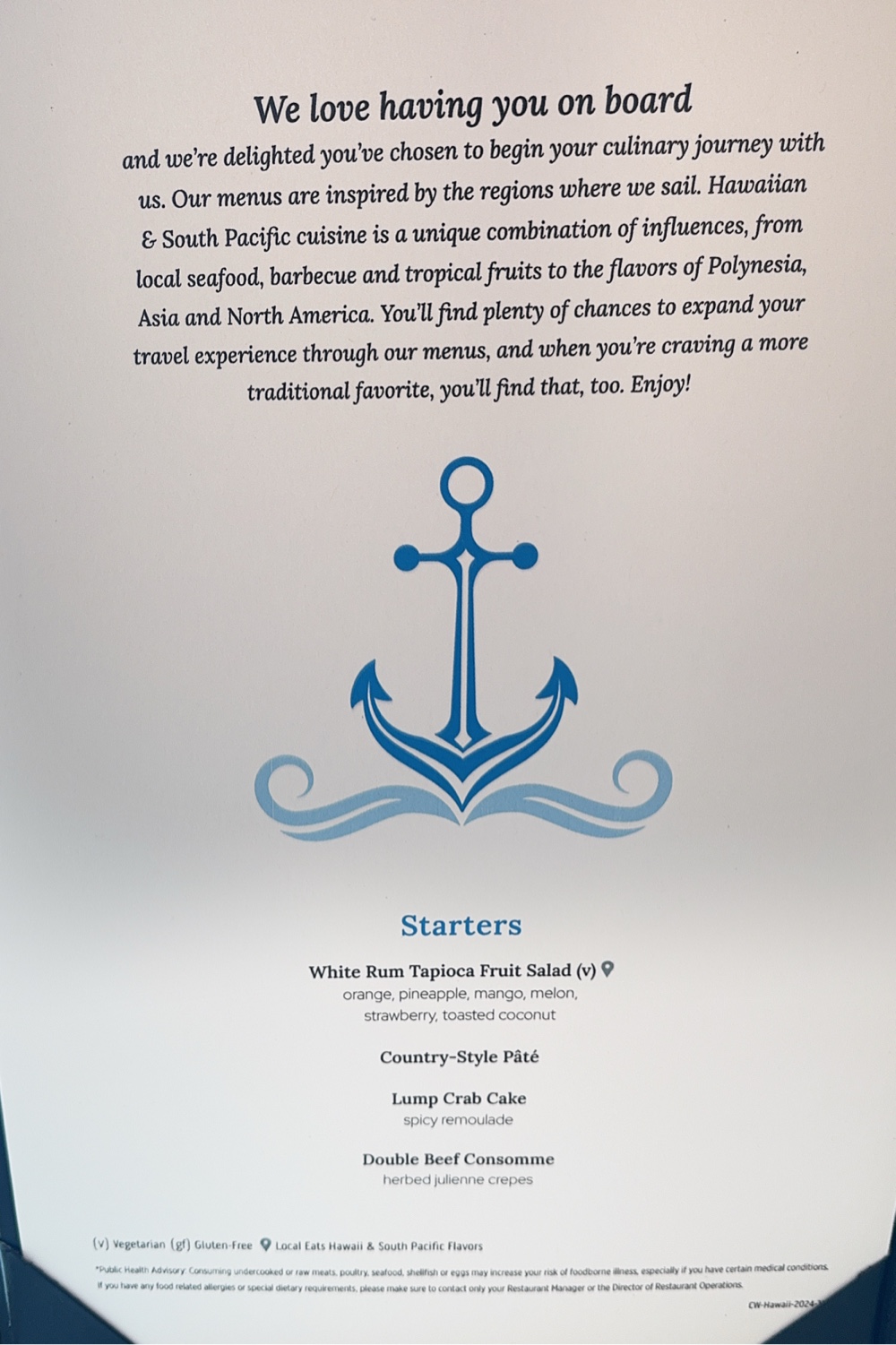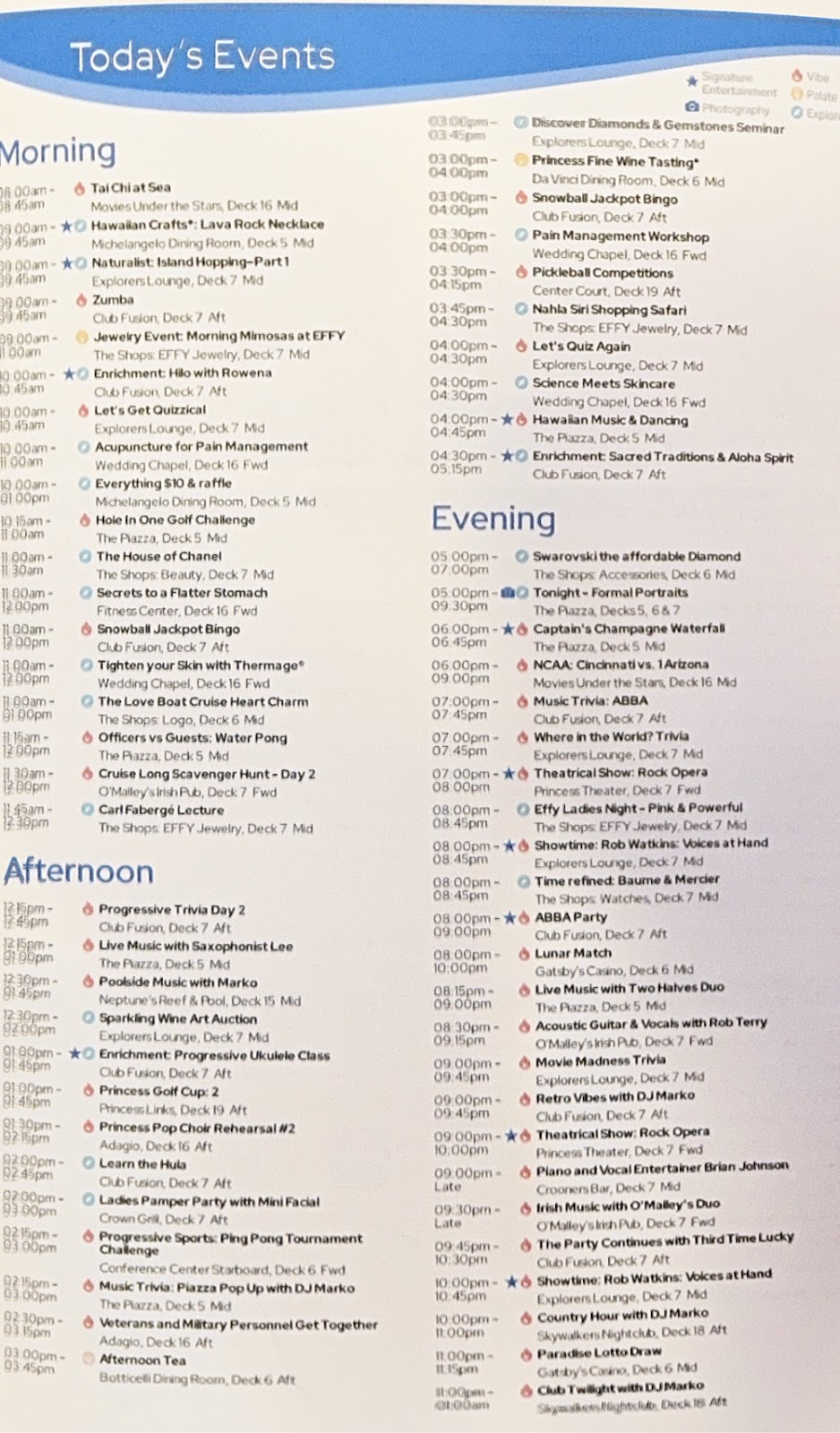 It was another busy day today. I went first to Hawaiian Ambassador Rowena’s lecture on Hilo held in Club Fusion (not nearly enough seats). I’m not sure why we have two other lecturers on board but I’m finding I get more out of Daniel’s and Suzanna’s, so I am going to attend Daniel’s in person and watch Suzanna's (usually held at 4pm which conflicts with our evenings) on our cabin TV. She actually gets into the history and ancient culture a little more than the others; Daniel covers more geology and wildlife (whales!!).