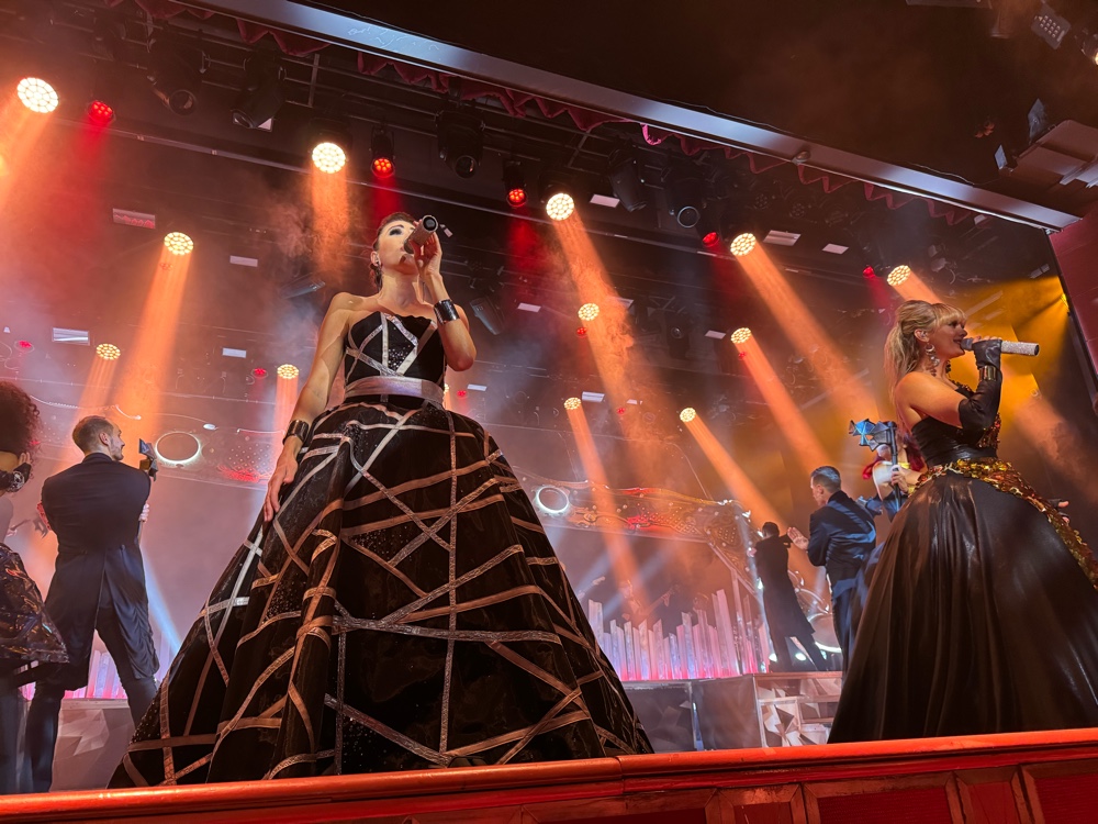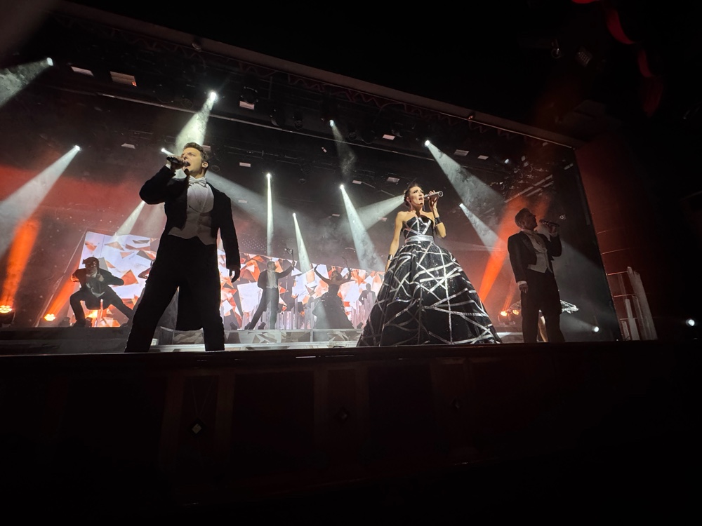 I left the waterfall before the officers were introduced to get us two front row seats in the Princess Theater for tonight’s production show, Rock Opera. G went back to the cabin to get us sweatshirts and a MUTS blanket because it is just that cold in the front row of the theater.