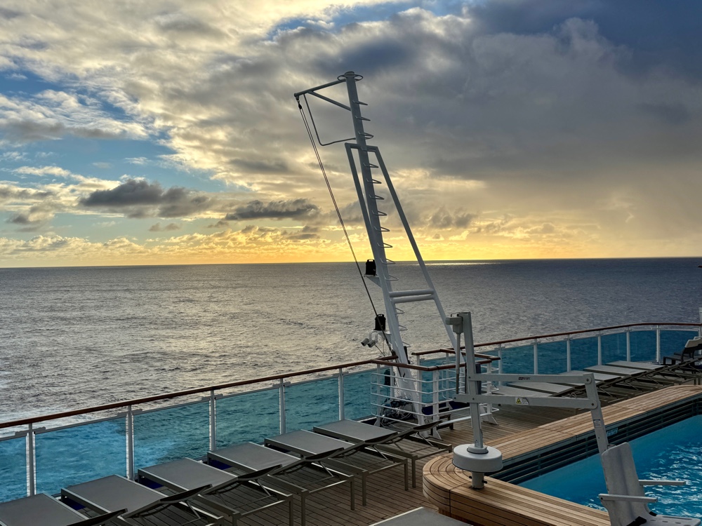 We returned to our cabin to see a view of the moon reflected on the water on our cabin TV’s ship cam channel. I threw on warm clothing and dashed out of our cabin, intending to go out on the area above the bridge, but it was closed off. I guess that’s not a surprise, and it likely is every night. I just hadn’t noticed it before.